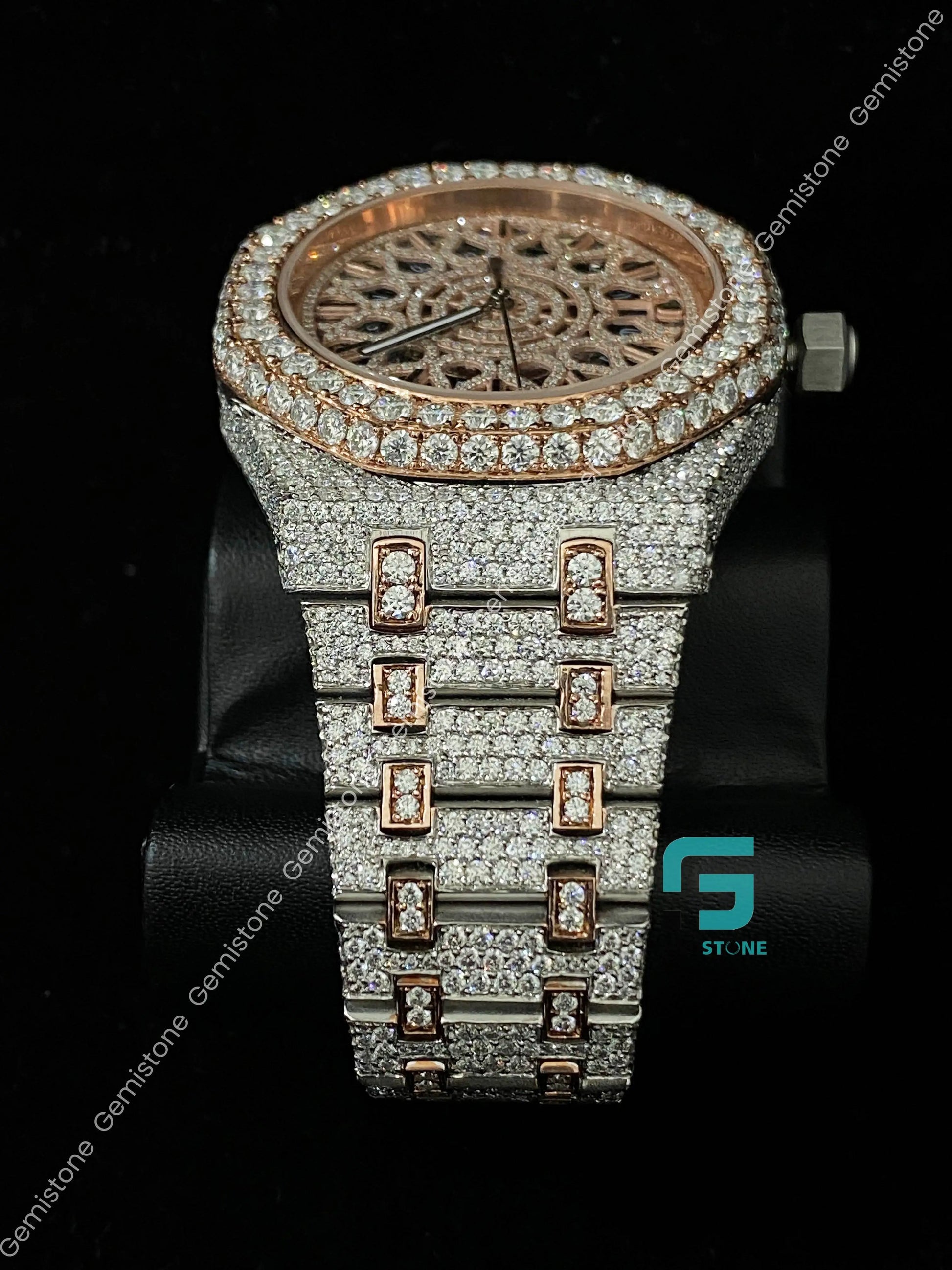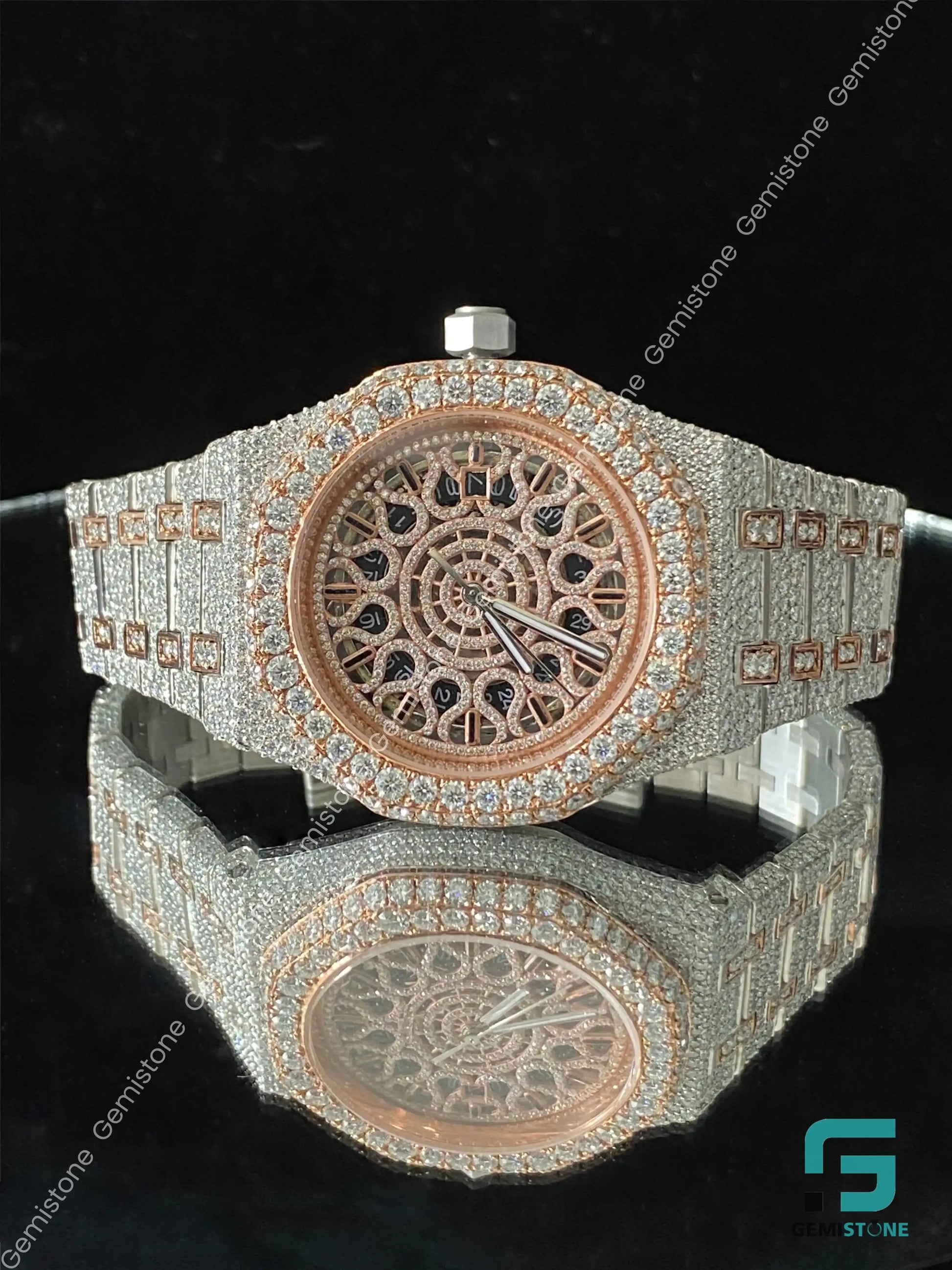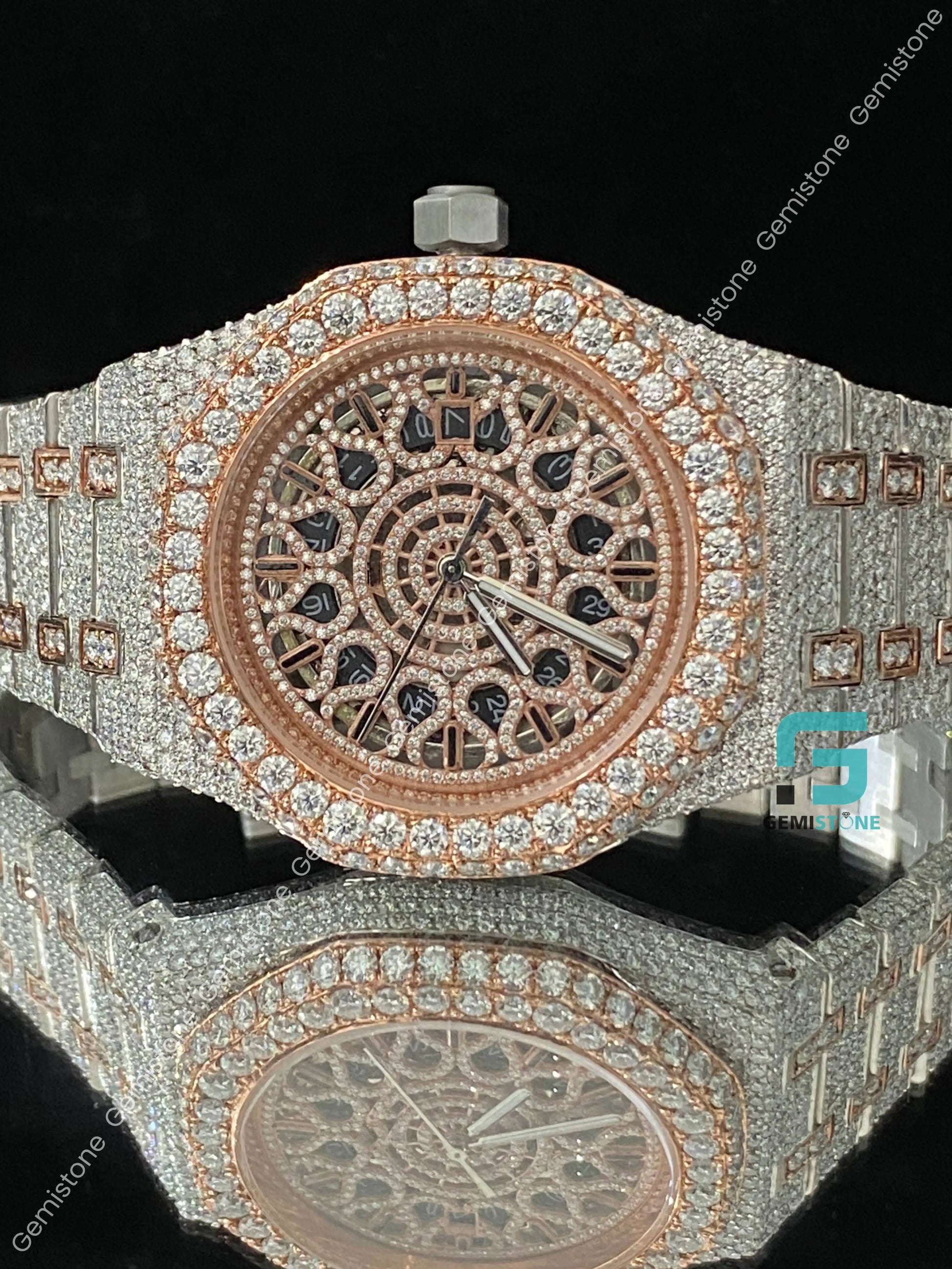 Two Tone Rose Gold Plated Skeleton Dial Moissanite Watch