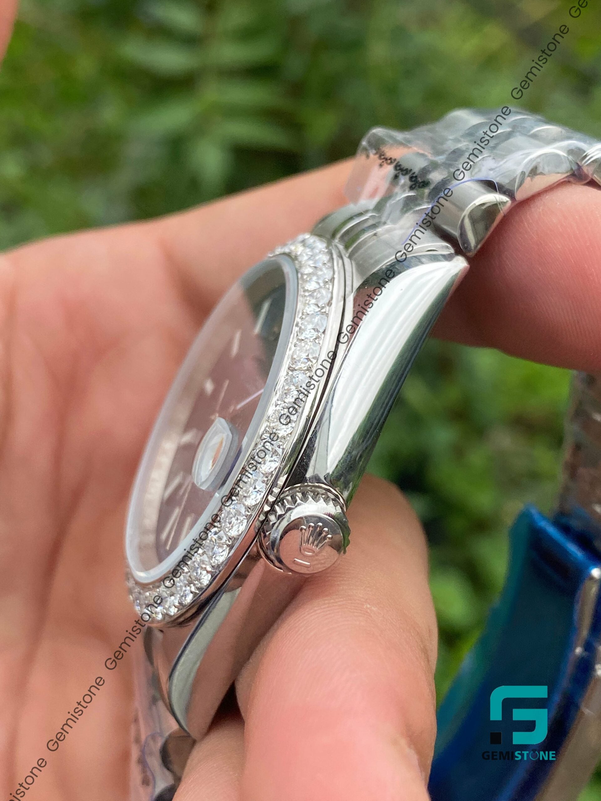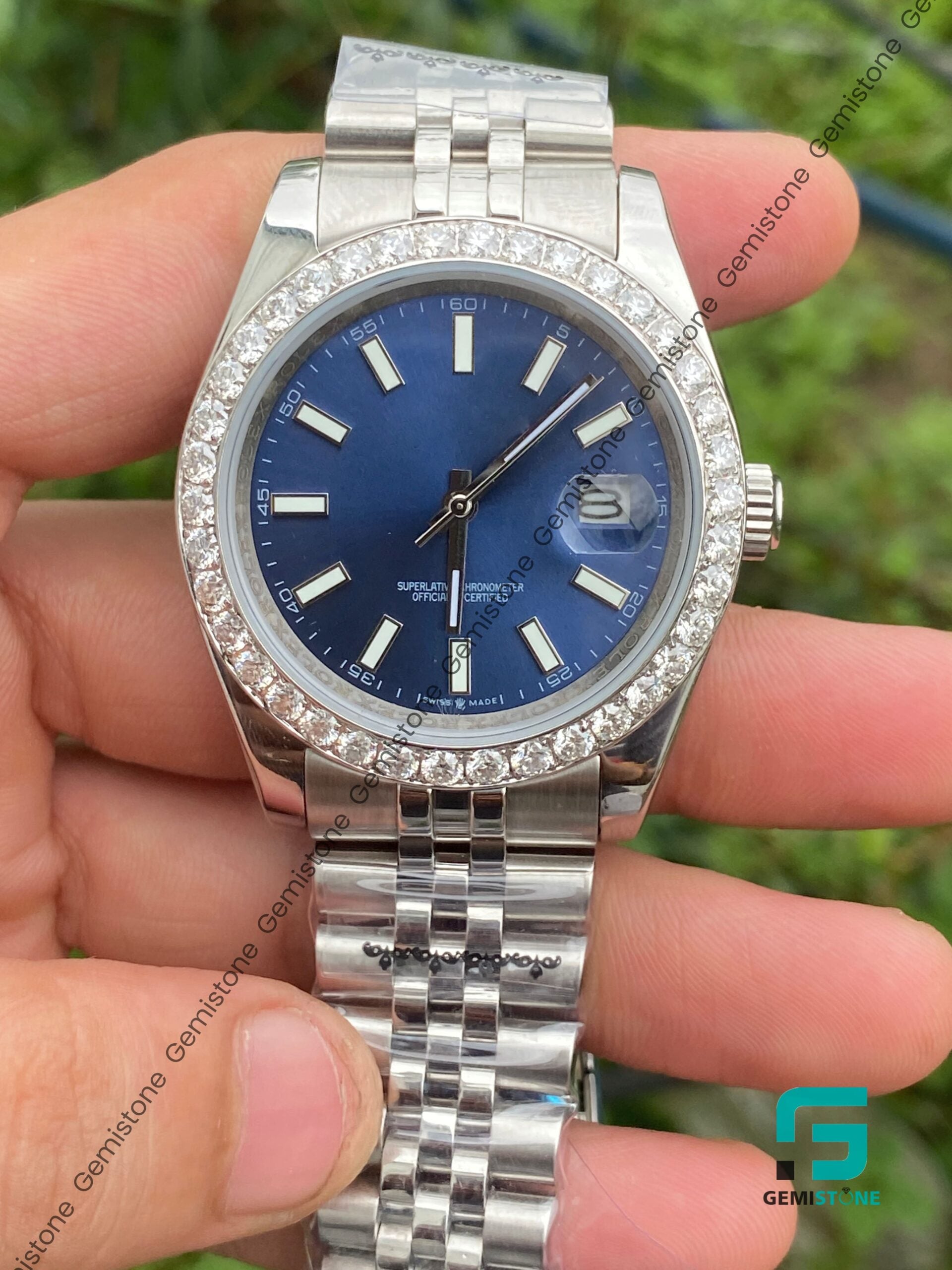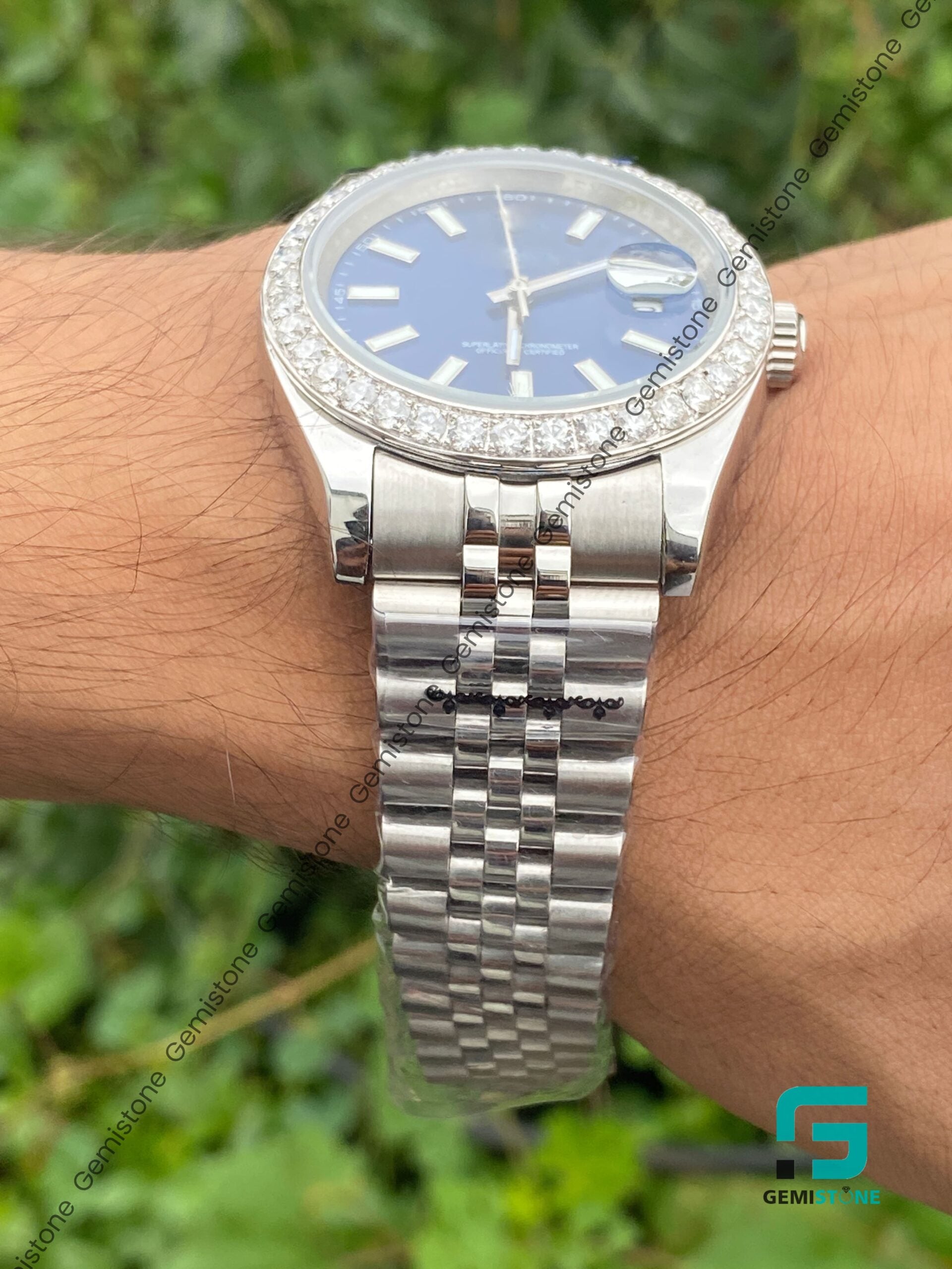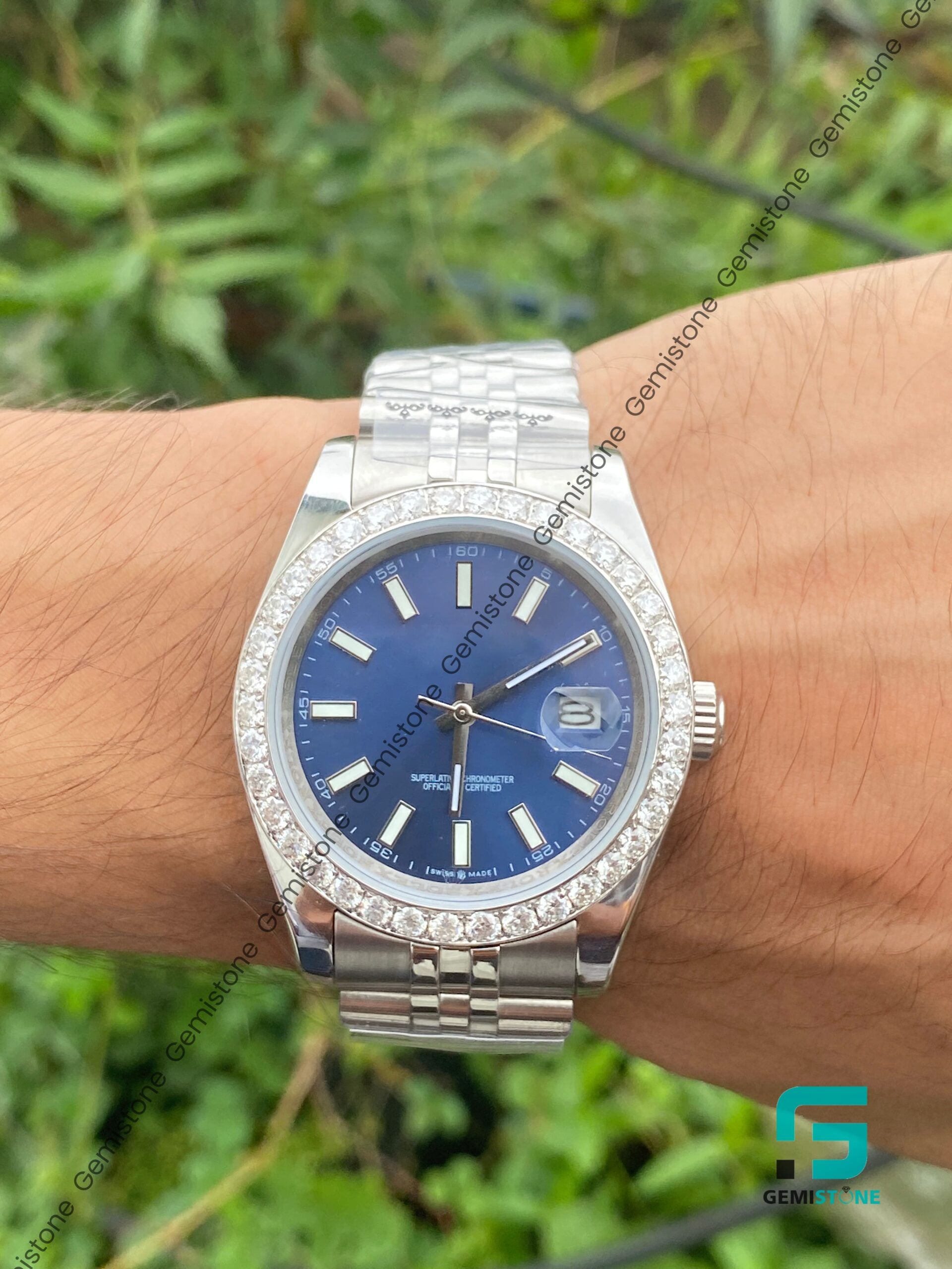 VVS Moissanite Bezel Diamond Intense Blue Dial Date Just Watch